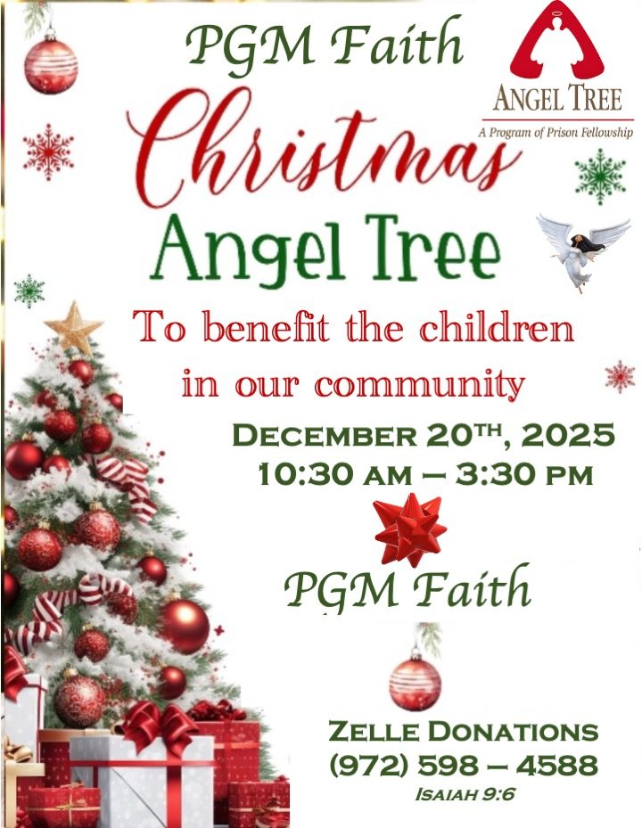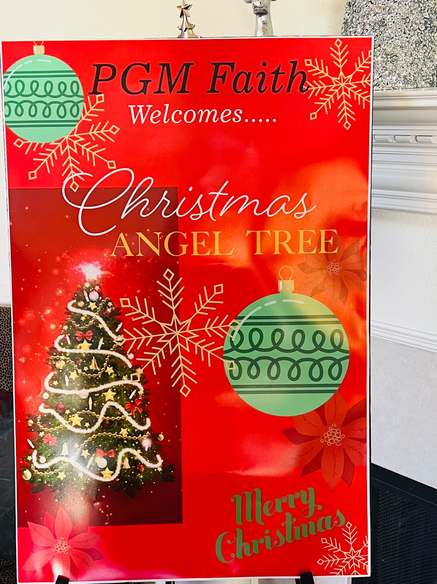 PGM Faith believes in giving and helping their community and gives with An Angel Tree event. This event is a charitable Christmas program, famously run by the Salvation Army, and Prison Ministries where anonymous donors "adopt" children, seniors, or families in need by selecting a paper "angel" tag from a decorated tree at a public location (like a mall or business) to purchase specific gifts like new clothes, toys, or shoes, ensuring vulnerable people experience the joy of receiving Christmas presents. The tags list age, gender, clothing/shoe size, and desired toy, with volunteers later organizing and distributing the donated gifts so parents can give them to their children, preserving dignity.